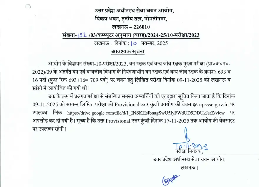 UPSSSC Forest Guard Answer Key 2025 OUT:उत्तर प्रदेश अधीनस्थ सेवा चयन आयोग (UPSSSC) ने विज्ञापन संख्या-10-परीक्षा/2023, वन रक्षक एवं वन्य जीव रक्षक मुख्य परीक्षा (प्रा०अ०प०-2022)/09 के अंतर्गत लिखित परीक्षा की Provisional उत्तर कुंजी आज 10 नवंबर 2025 को ऑफिसियल साइट पर जारी कर दी है।